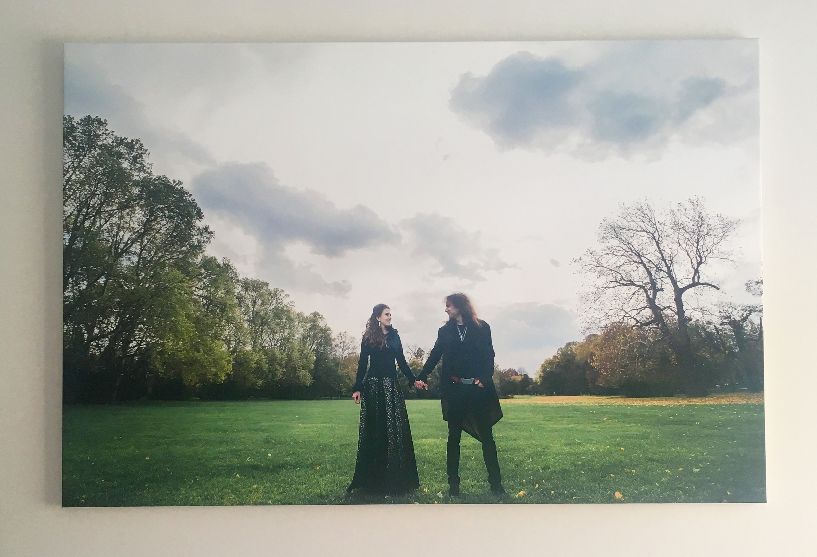 Nekem a klasszikus verzió van itthon, a kedvenc közös fotónk a férjemmel, 120 cm széles vásznon, 2 cm vastag vakrámára feszítve.