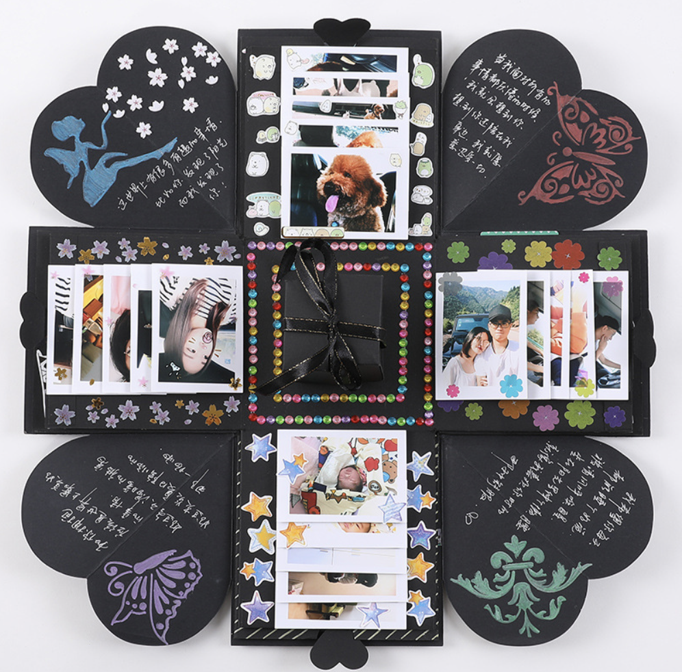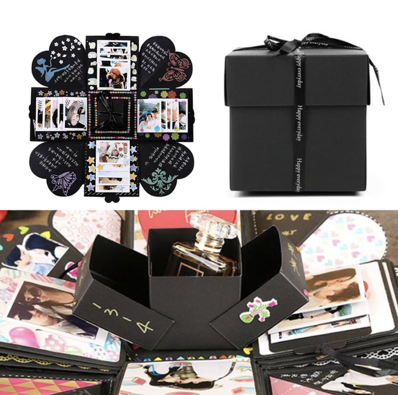 Őszintén megmondom, hogy élőben még sosem láttam ilyet, de nagyon tetszik. Összecsukva úgy néz ki, mint egy kocka alakú ajándékdoboz, de a szalagot levéve “szétrobban”. Mivel a belső rész kézzel készül, nekünk kell beleragasztani a képeket, megírni a szöveget, hatalmas meglepetést, örömet lehet vele okozni az ajándékozottnak.