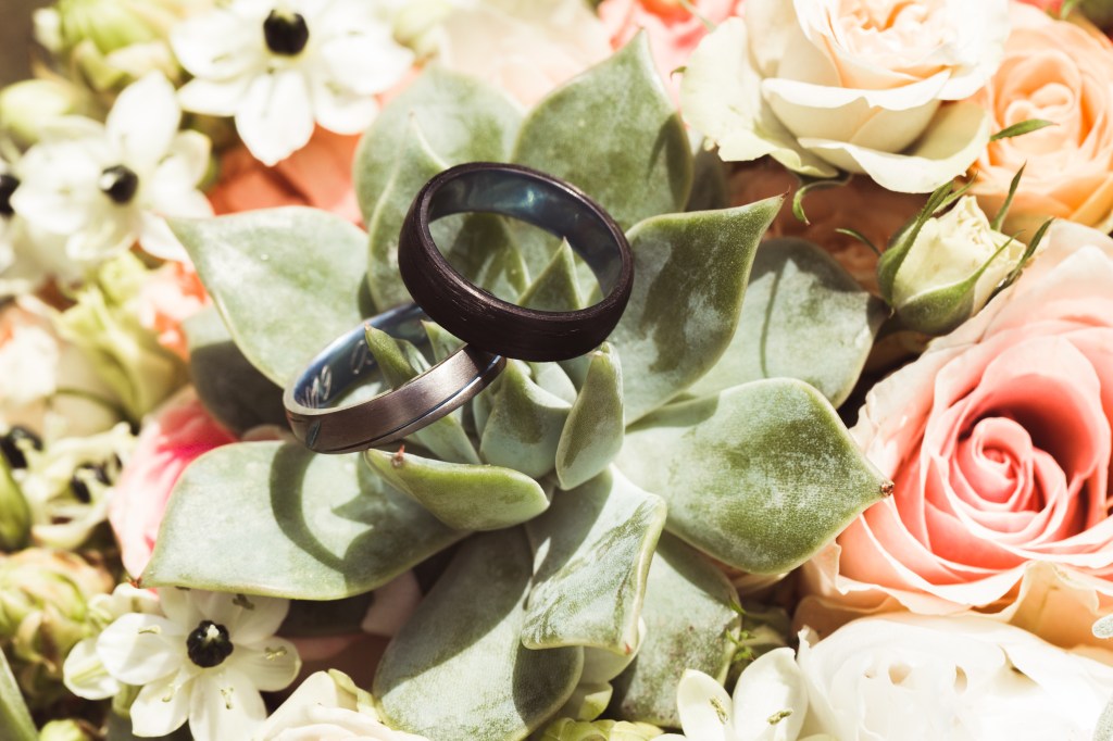 Őszinte leszek, nem kérdeztem meg, hogy miből készült, de a vőlegény gyűrűje kívülről fa mintázatú volt. Az sem megszokott, hogy a két gyűrű teljesen különböző, de nagyon tetszett az ötlet, hogy egyedi, a menyasszony és a vőlegény stílusához illő ékszereket készíttettek.