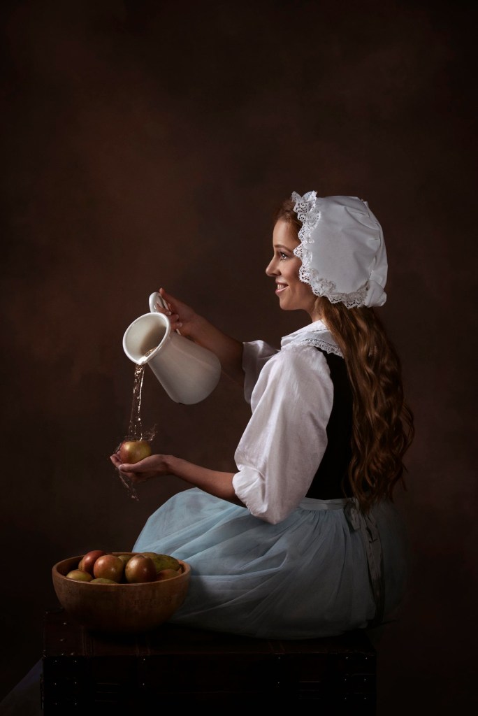 Ami bizonytalan volt, hogy a szolgálólány ábrázolással mi legyen, mert a ruha nem olyan látványos, mégis nagyon fontos része Hamupipőkének, nem hagyhattuk ki. Eszembe jutott, hogy ábrázoljuk “festményként”, nézzen ki úgy a fotó, mintha régi idők nagy mesterei festették volna. Beugrott Munkácsy Mihály: Köpülő nő c. festménye, ami adta az irányt, viszont színvilágban inkább Rembrandtot szerettem volna idézni, mert nagy rajongója vagyok annak a képi világnak, amiben ő alkotott.